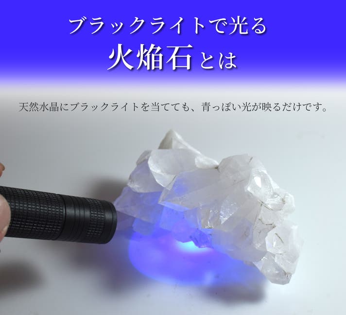 通常、ブラックライトは対象物を青く照らし出します。宝石業界では宝石の傷や樹脂などの接着剤の使用の有無などを確認するため、よく使うツールです。