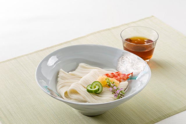 創業300年、昔も今も。小麦粉、塩、水、少量の綿実油を使用し、気温や湿度に合わせて配合。熟練のそうめん師の絶妙な加減で寒期に約36時間かけて細いそうめんに仕上げていきます。