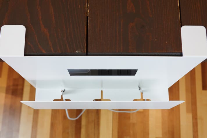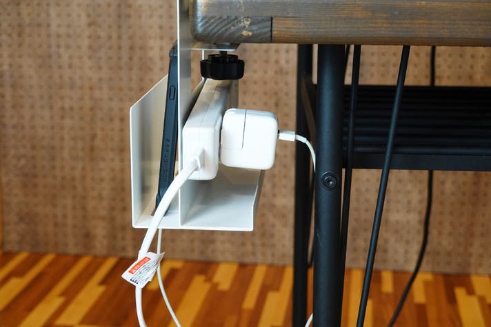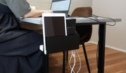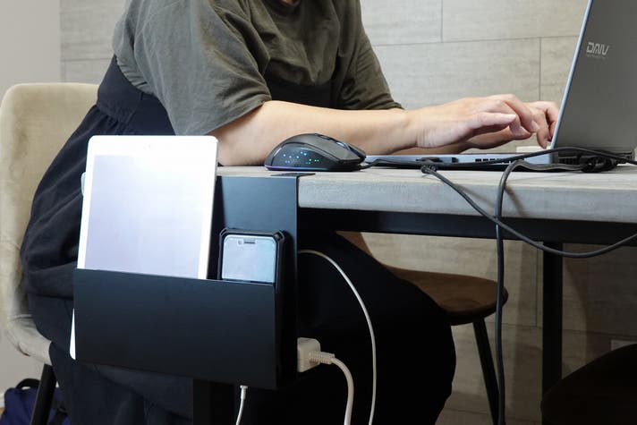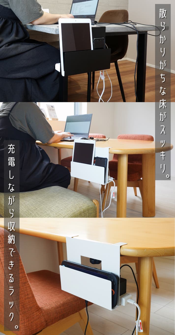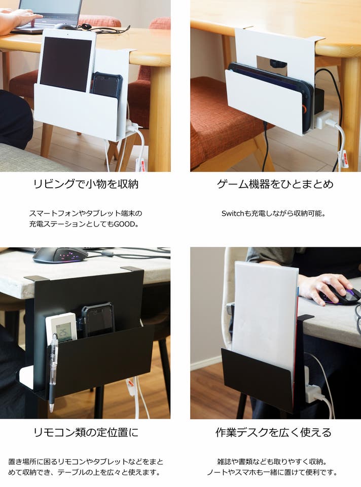 『テーブルサイド充電ラック』は、ダイニングテーブルやデスクの天板に簡単に取り付けられる便利な収納ボックスです。