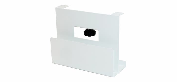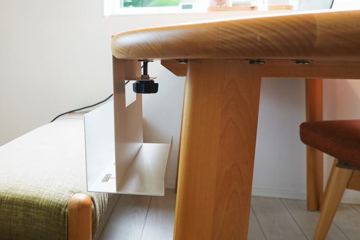 設置は穴開け不要で、引っ掛け部分でテーブルやデスクの天板を挟み込んで、調節ネジで固定するだけ。
