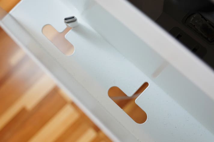 底面にはケーブルが通せるスリットが3か所入っているので、スマートフォンやタブレット端末、ゲーム機材などを充電しながら収納することができます。