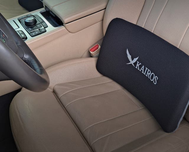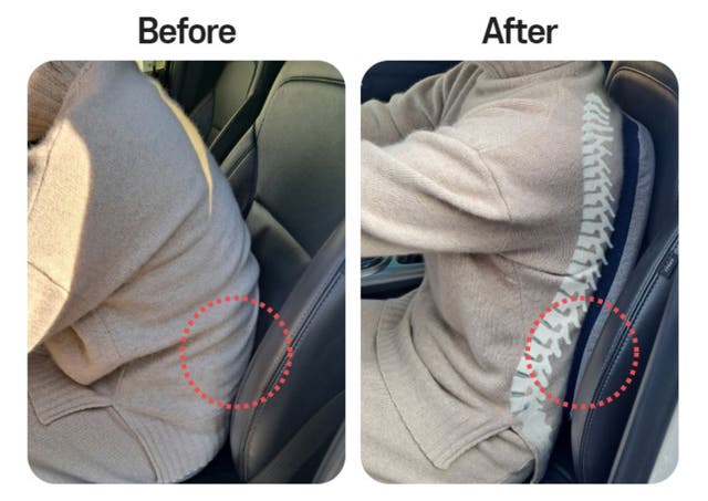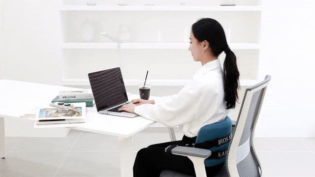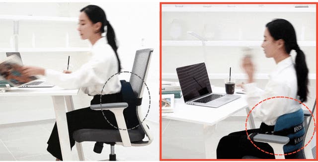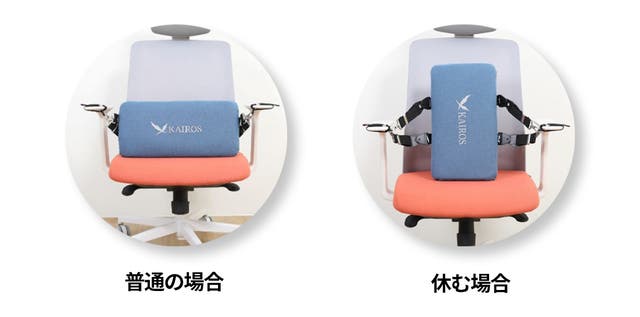 カイロス「腰ピッタリ・クッション」を椅子に置いて座るだけで、背もたれと腰の間の隙間を埋めて、S字状カーブを描けるようになり、腰への負担を和らげます。