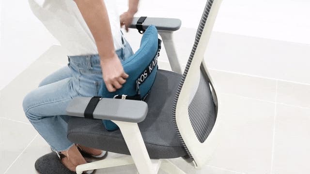 終わりましたら、ご自身の身体に合わせてクッションの位置を調整してお尻を椅子の一番奥まで入れるようにして座ります。これで脊椎を整える準備は終わり!