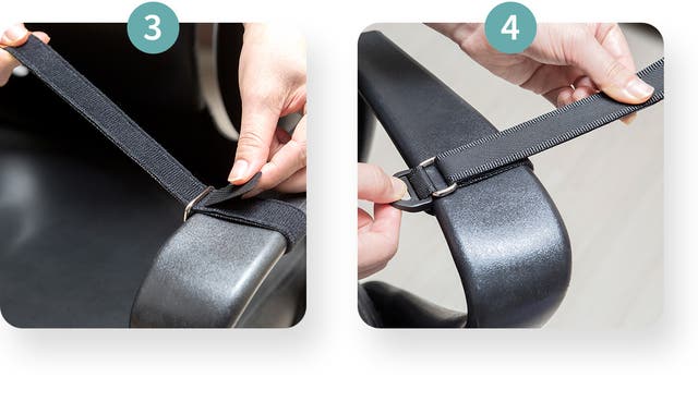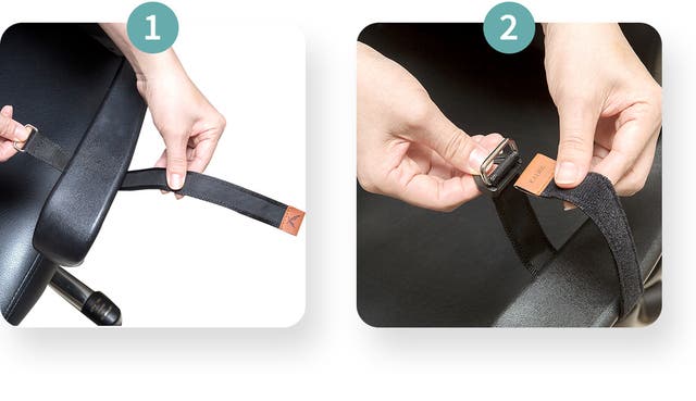 - 取り付けはとても簡単。椅子の肘掛けにバンドを掛けるだけで終わり。
