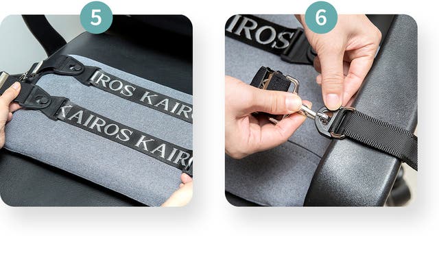 カイロス「無重力クッション」の設置方法はとても簡単!椅子の肘掛けに固定用バンドを付けて、強力バンドを掛けるだけで終わり。