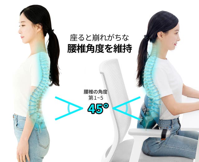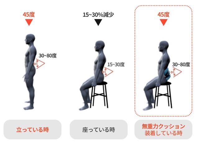 カイロス「無重力クッション」は座っている時でも、腰部の屈曲が45度になるようにサポートし、脊椎にかかる負担をやわらげます。