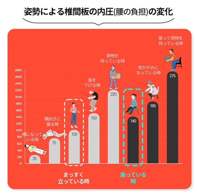 実は、立っている時(内圧100)より座っている時(内圧140)※の方が体への負担が大きい!