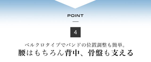 骨盤を集中ケアしたい、または腰が弱い方は、ベルクロ・バンド2本とも下部につけてください。骨盤を支えることで正しい姿勢を導きます。