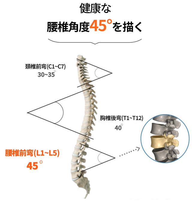 腰椎は第1~5までの5つの椎骨になっていて、これらの角度が45°になるのが理想的だと言われています。