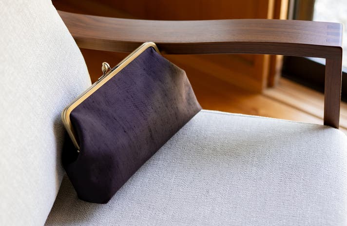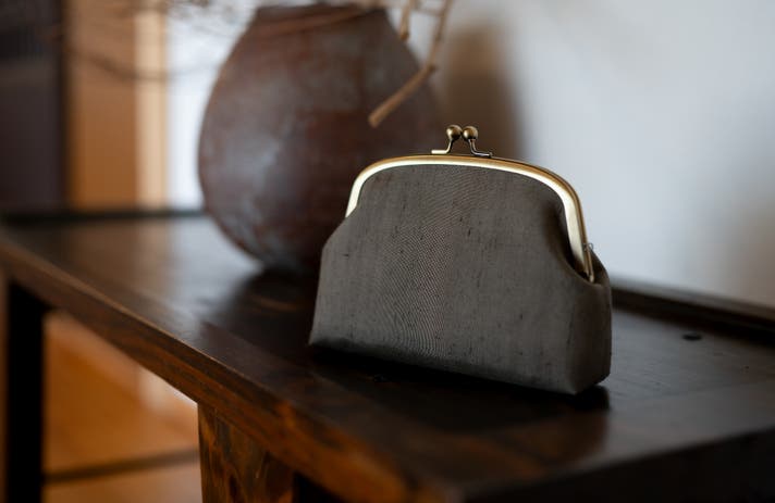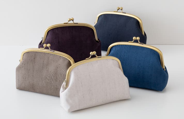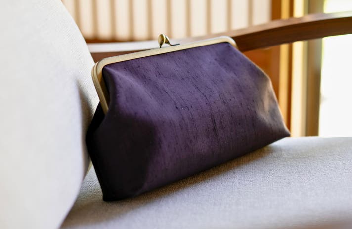 - 艶とフシが美しい牛首紬の反物を使った、 一つひとつの個性が輝くがまぐちバッグができました。