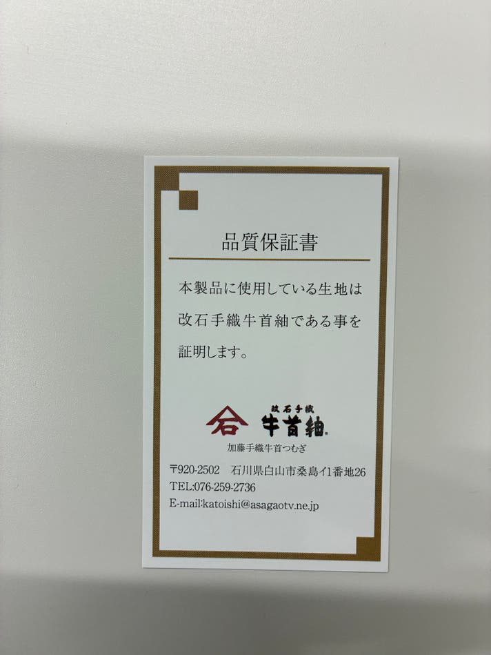 「改石 牛首紬」であることを証明する保証書をお付けいたします。