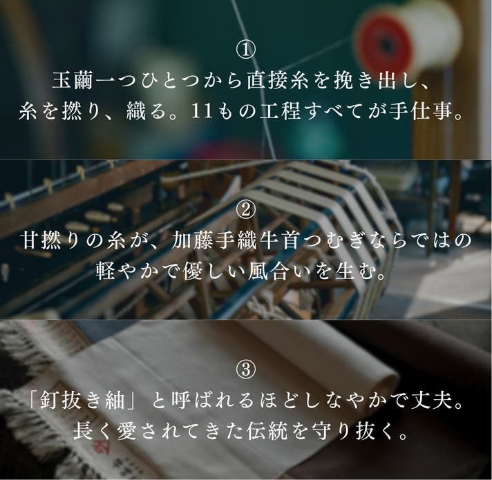 加藤手織牛首つむぎの肝、甘撚りとは玉繭をのべ引きで集めた糸にほとんど撚りをかけないこと。絹の深い艶としなやかさ、使ってもふわっと戻る復元力が際立つ——。