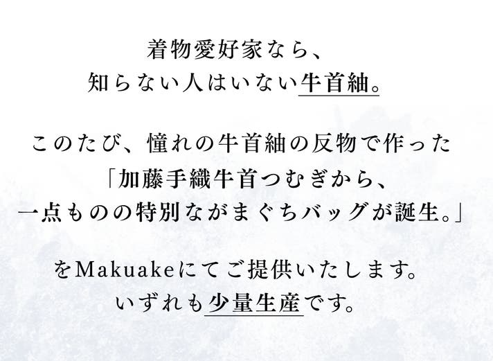 「Makuake(マクアケ)」は、実行者の想いを応援購入によって実現するアタラシイものやサービスのプラットフォームです。このページは、 ファッションカテゴリの 「800年の伝統の技が息づく総手仕事・少量生産の牛首紬の反物をバッグに」プロジェクト詳細ページです。