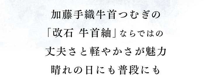 祖母、そして父・改石が守ってきた伝統製法で、全工程を手仕事のまま織り続ける〈加藤手織牛首つむぎ〉。白山市・桑島で“総手仕事”に誇りを持ち、家族と職人が量より質を貫き、現当主は改石の志を受け継いで白生地のみを「改石 牛首紬」の名で反物に仕立てています。なお改石は2000年に(一財)民族衣装文化普及協会「日本きもの文化賞」を受賞するなど、その仕事は高く評価されています。