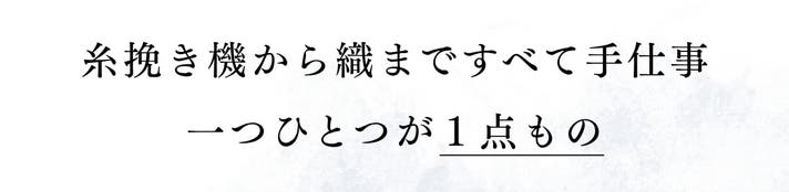 反物は繭から糸を挽くところから、織って仕上げるまで、すべて職人が手で行っています。私たち加藤手織牛首つむぎは、すべての作業を手仕事で行っています。場所によってフシや光沢が微妙に変化するので、同じものは存在しません。