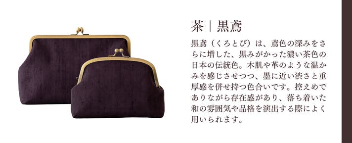 繭の個性や、織り方、フシの様子などによって色合いが微妙に異なるため、一つひとつが一点ものと言ってよいバッグです。それぞれに深みのある色合いです。日本の伝統色を意識した色をご用しました。和の気品とモダンさをお楽しみください。