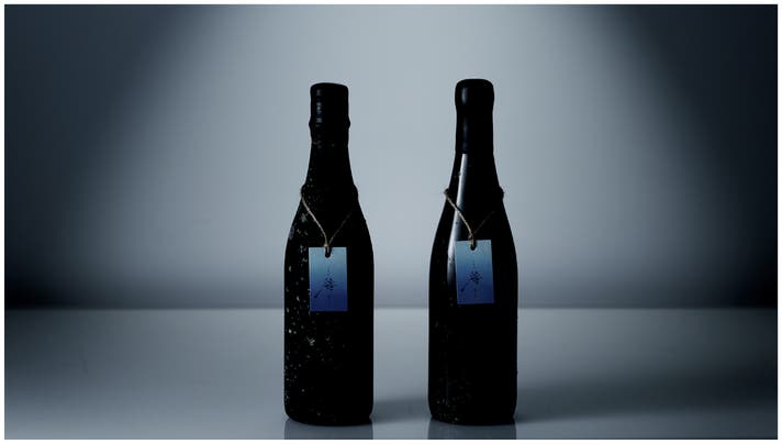海底熟成を経た瓶には、海中の生き物たちが描き残した模様が浮かび上がります。星をちりばめたようなその姿は、一本として同じもののない、海の偶然が生んだアート。その美しさを引き立てる、特別な色の瓶を選びました。
