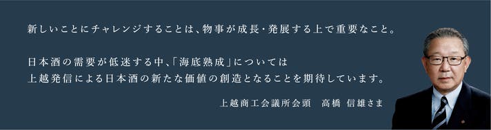 試飲会開催にあたり、海底熟成酒へのチャレンジについて、上越商工会議所会頭 髙橋 信雄さまよりメッセージをいただきました。