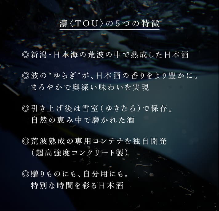 濤〈TOU〉は、日本海の荒波に育まれた、特別な海底熟成酒。