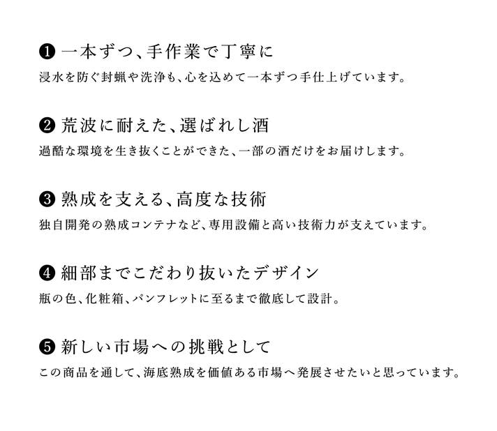 ひとつひとつ丁寧につくりあげた海底熟成酒を、物語の余韻とともにお楽しみください。