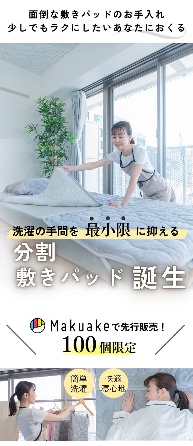 「Makuake(マクアケ)」は、実行者の想いを応援購入によって実現するアタラシイものやサービスのプラットフォームです。このページは、 プロダクトカテゴリの 「【ズボラな人必見】面倒な洗濯をラクにする!ハンガーで干せちゃう分割敷きパッド」プロジェクト詳細ページです。