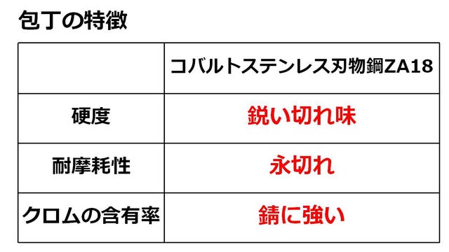 コバルトステンレス刃物鋼ZA18は硬度が高く、耐摩耗性に優れているので、切れ味抜群で永切れ(長続き)します。ほかの刃物鋼に比べてクロムの含有率が高く、不錆性能において特に優れています。