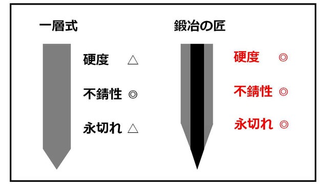 鋼材が全て一体となった1層式で構成されているダマスカス包丁は、芯材となるハガネが柔らかく切れ味が落ちやすい特徴があります。