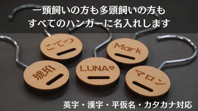 ●すべての製品を国内の自社工場で製造しており、すべてのハンガーに名入れ対応が可能です。多頭飼いならではのお悩みである「どちらがどの子の服だっけ」を解消します。