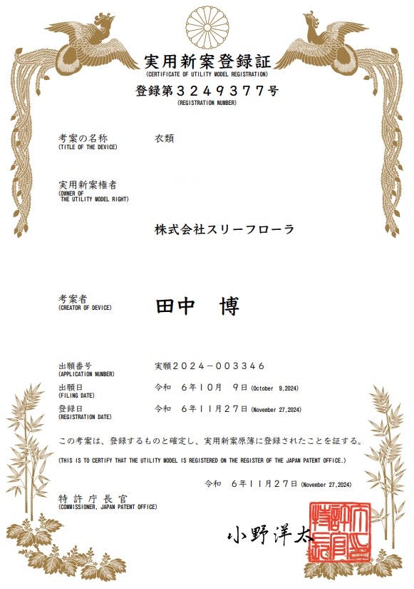 袖のデザインは、実用新案登録 を取得したオリジナル仕様です。