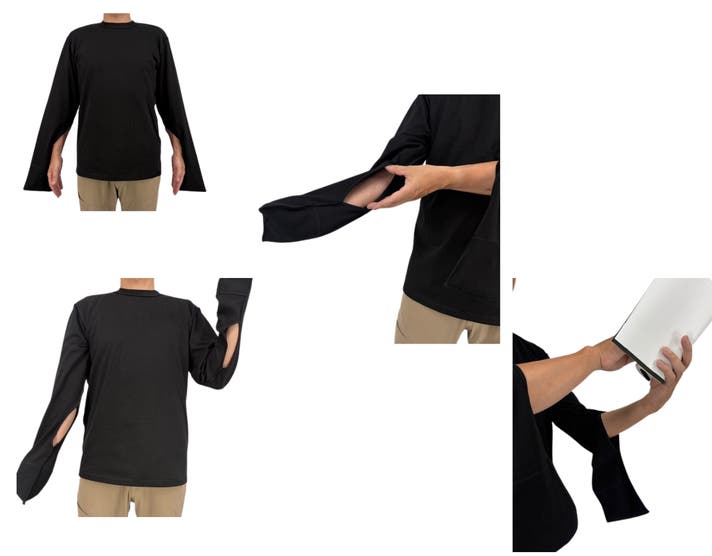 袖のスリット窓から必要に応じて手を出すことができ、就寝前のスマホ操作