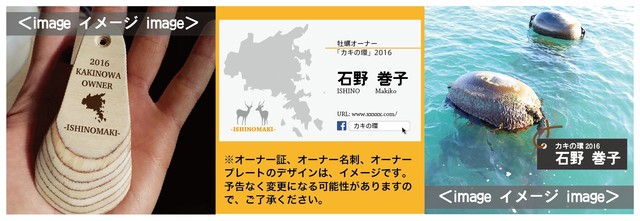 このオーナー証は、木製の牡蠣の殻をモチーフにした、石巻の若手職人の完全手作り!あなたのお好みで、キーホルダーにしたり飾ったりできます。あなたの名前が入った名刺(20枚)は「わたし、牡蠣育ててるんです」と、ご友人に配って、お酒の席ででも話のネタにして楽しんでください!