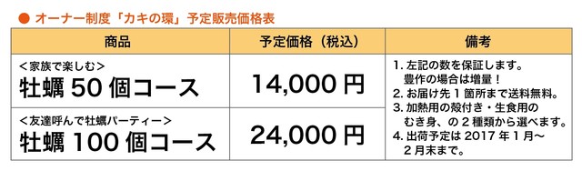 ご参考までに。こちらが牡蠣オーナー制の予定販売価格です。