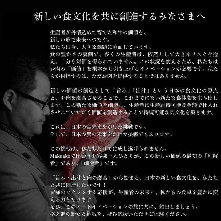 これは単なる味付け肉ではありません。和牛とだし文化を融合させた、新しい「和食肉」。この日本の新たな食文化を、国内はもちろん、世界にも食の素晴らしさと発信と挑戦をしていきたい。
