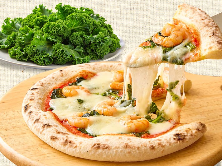 このピザには、「きらきらベジ サラダケール」を約1袋分(50g)も贅沢に使用。 ケールの風味とシャキッとした食感が、ぷりぷりのエビと絶妙にマッチ。 とろけるチーズとともに焼き上げれば、まるでレストランで味わうような本格派の一枚に。
