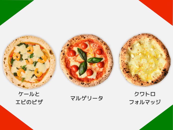 今回はこの「ケールとエビのピザ」をメインに、 林シェフの人気メニューからマルゲリータなど定番2種を加えた計3枚セットでお届けします。