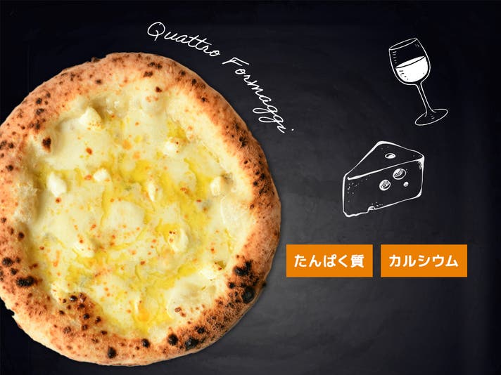 その名の通り4種類のチーズを使用した贅沢なピザ。ワインとの相性も良くチーズ好きにはたまらない1枚となっています。