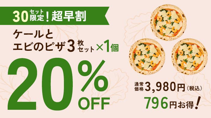 30セット限定!超早割 「ケールとエビのピザ」3枚セット 20%OFF