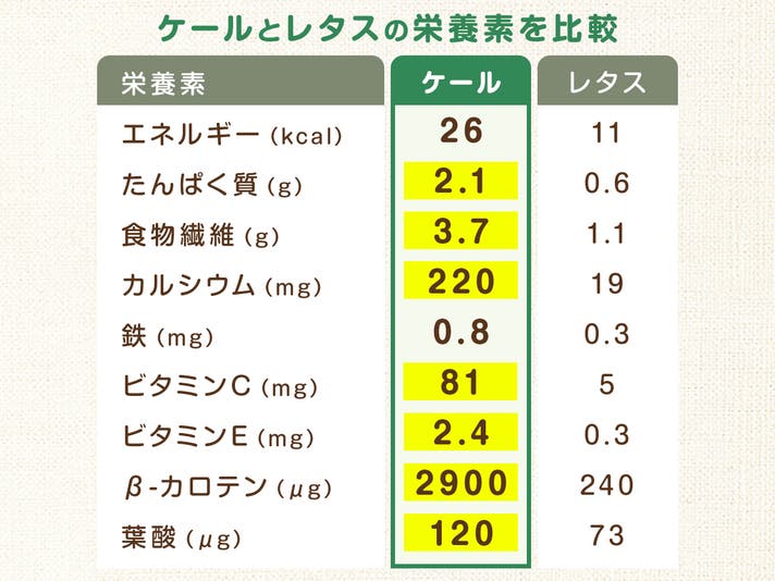 ケールは食物繊維、ビタミンC、βカロテン、葉酸、など栄養も豊富!