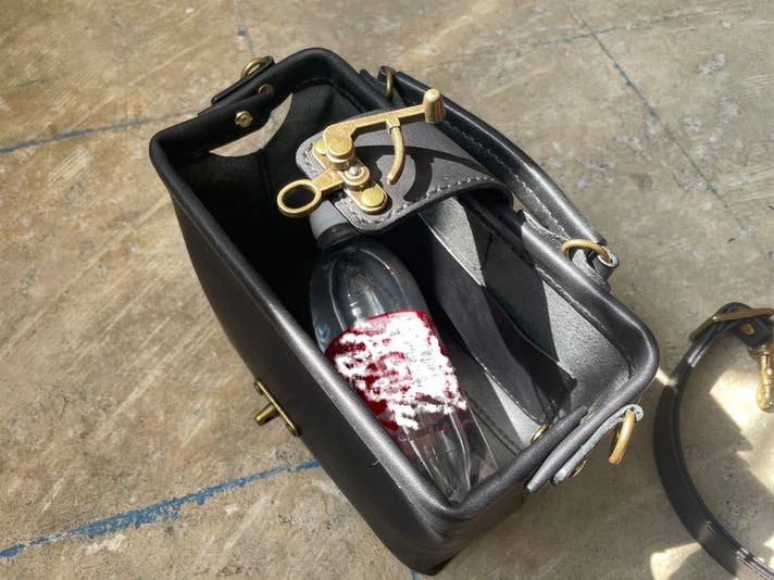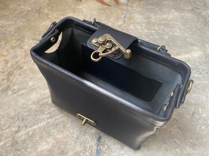 “コ”の字型の金具を2つ、バッグ上部(前後)に取り付け両端をネジ留めする事で、“ロ”の字型に大きく開く、出し入れのスムーズなバッグとなります。