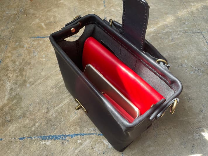 口枠金具を使用した間口の広いダレスバッグ