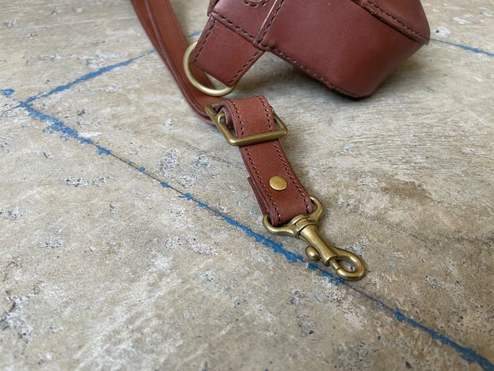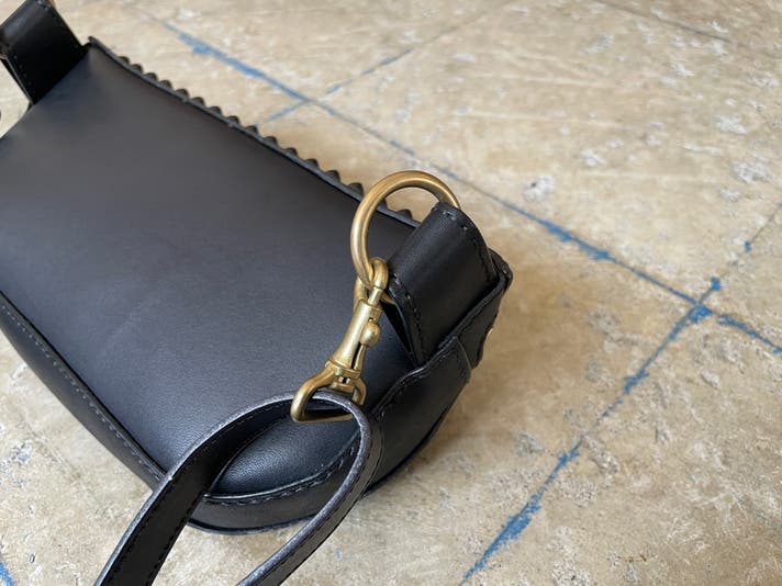 またバッグ側の連結部分は真鍮製のリングを採用し、くすんだゴールドの質感とデザイン性、革の部分に負荷が掛かり過ぎない形状となっております。