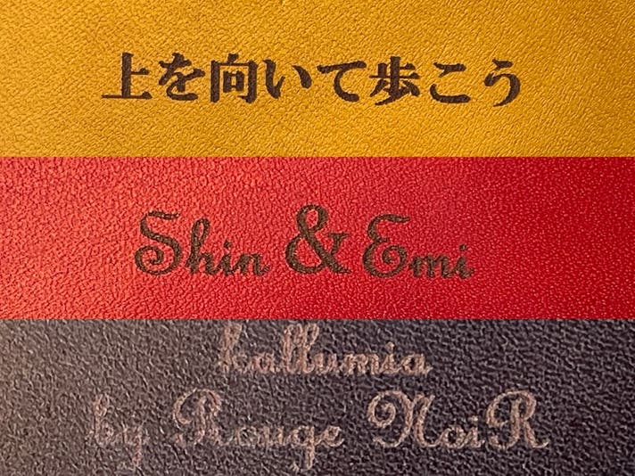 ※上からバナナイエロー、クリムゾンレッド、ブラックにレーザー加工したサンプル画像