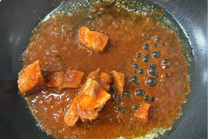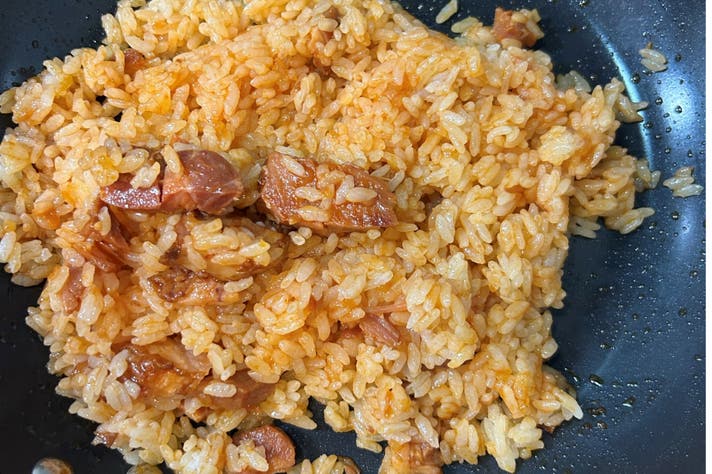④ご飯200gを入れ、ソースを全体になじませる。