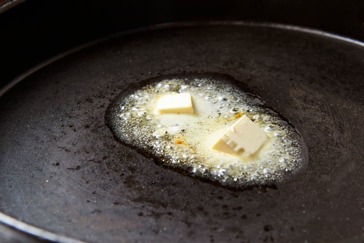 ①フライパンにバター(7~10g)を投入し、中火で溶かす。(お好みで玉ねぎやグリーンピース等を一緒に炒めるとより本格的!)