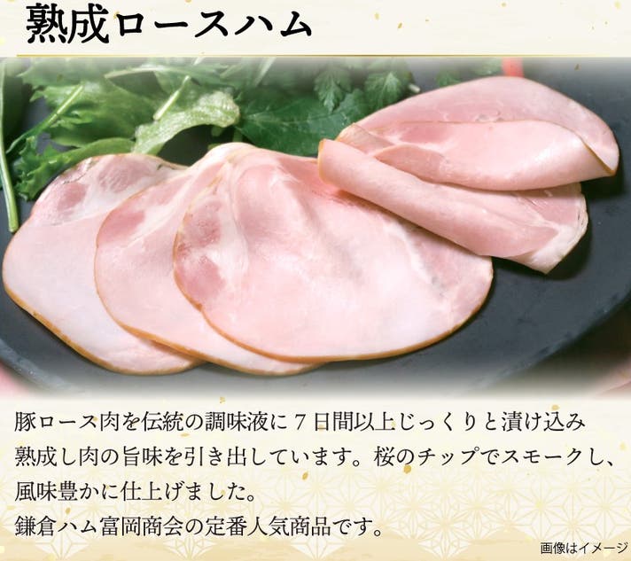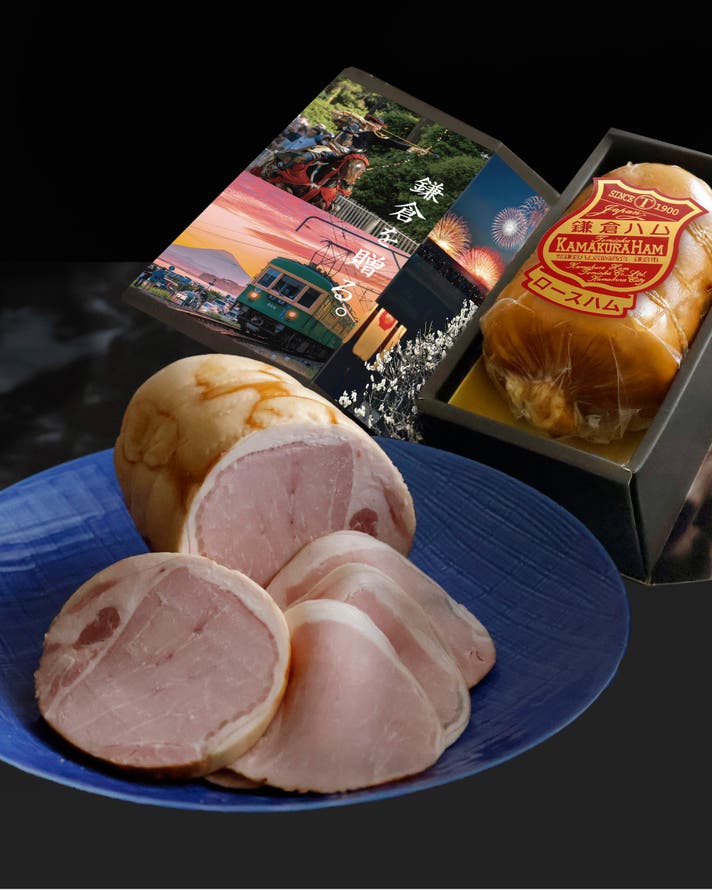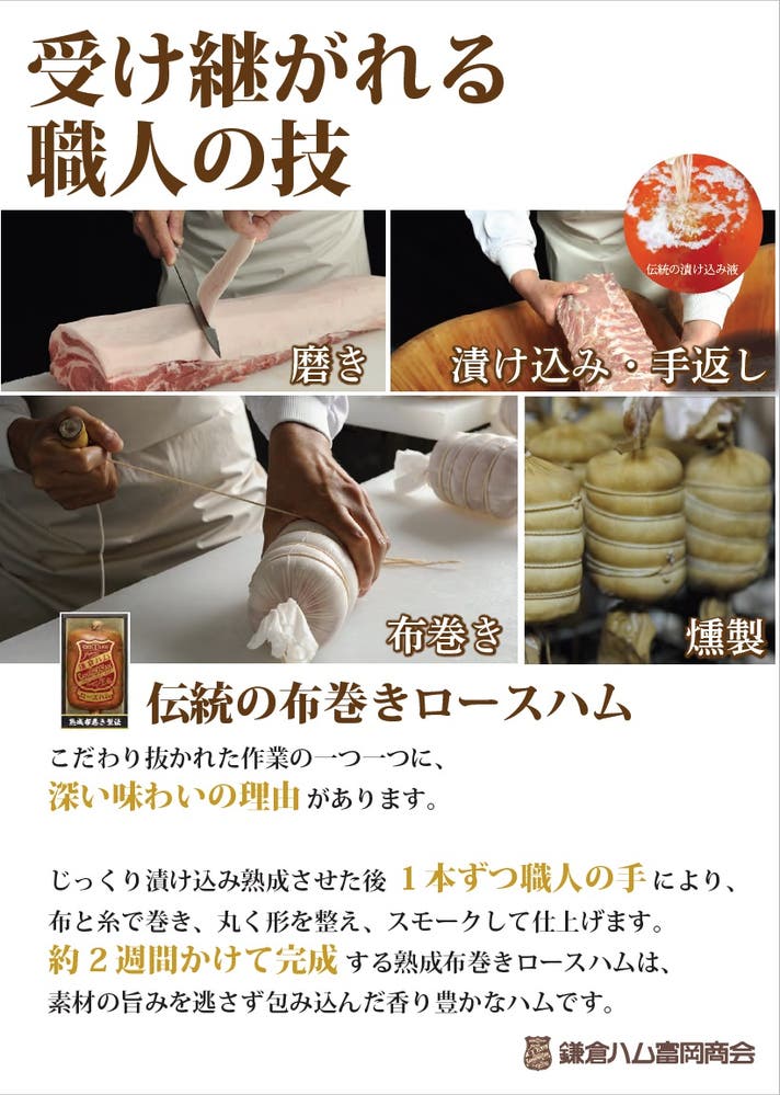 国産豚ロース肉を香りのよい伝統の調味液に漬けこみ熟成させ肉の旨味を引き出し、職人が1本1本手で布を糸で巻き、丁寧に仕上げた鎌倉ハム富岡商会の代表商品です。