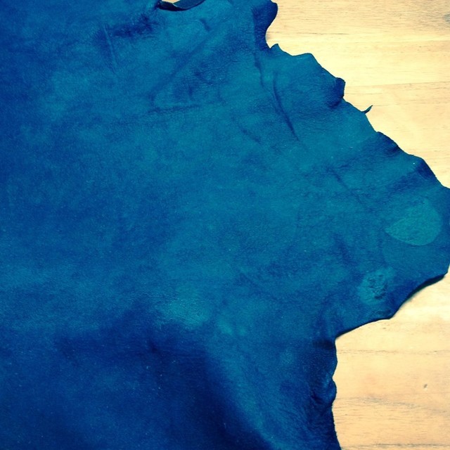 その他、様々な工程により、革は作られているのですが、特に、インディゴ染めの革は、通常の革の染色よりもとても条件が難しく、繊細な作業を要します。