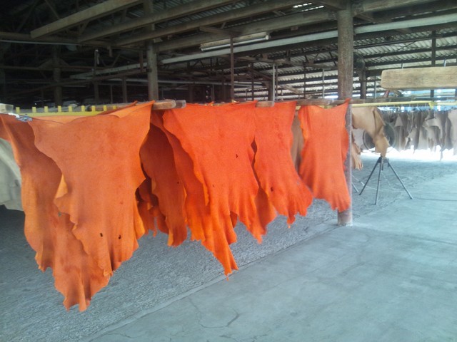 染色後、ドラムから出した革を、一旦整えて、自然干し乾燥へ。