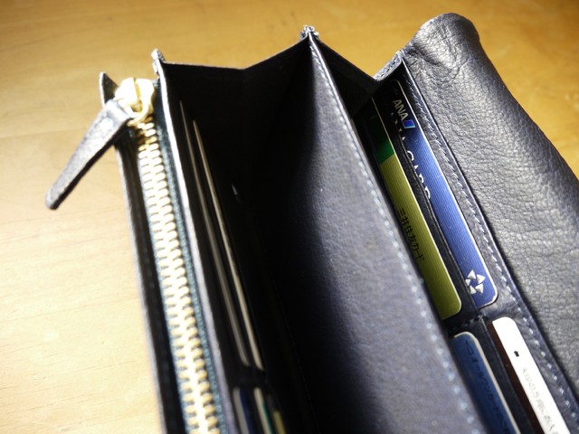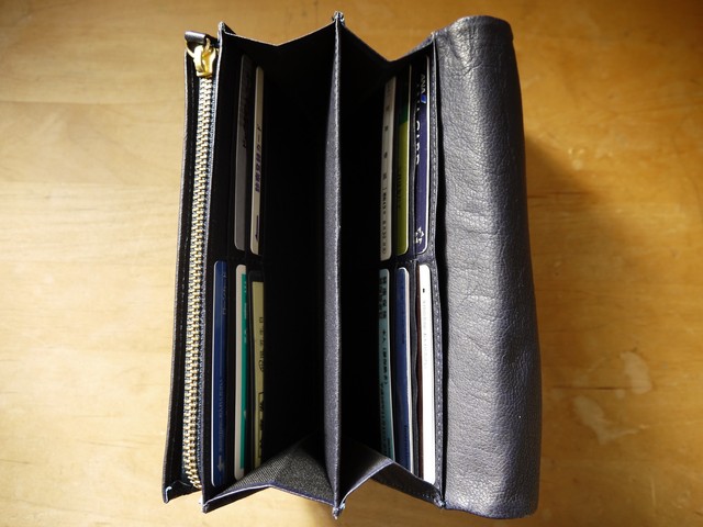 中はカードが14枚、その他、お札入れなど、大口収納スペースが4箇所の大容量。