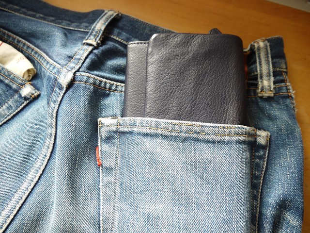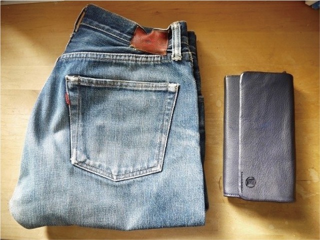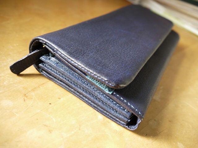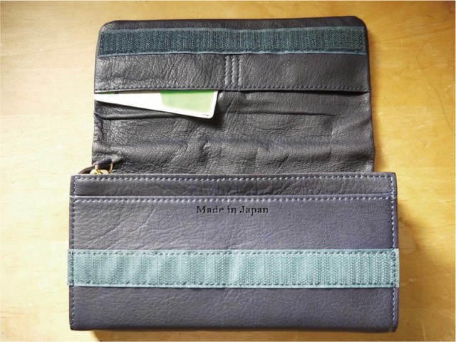 しかも、珍しいインデイゴ染めの革を使っているので、経年変化が楽しみな一品です。そして、この商品の変わった仕様として、革の財布には珍しいマジックテープで蓋を閉じるところ。使ってみたら良く分かりますが、これが凄く便利なんです。開けるのも、閉じるのも、とっても楽です。