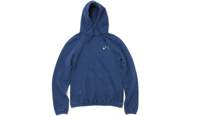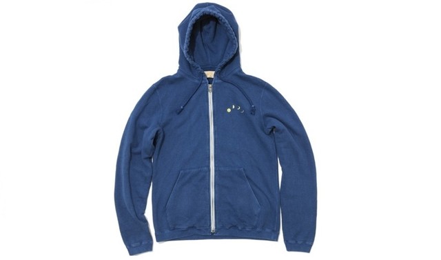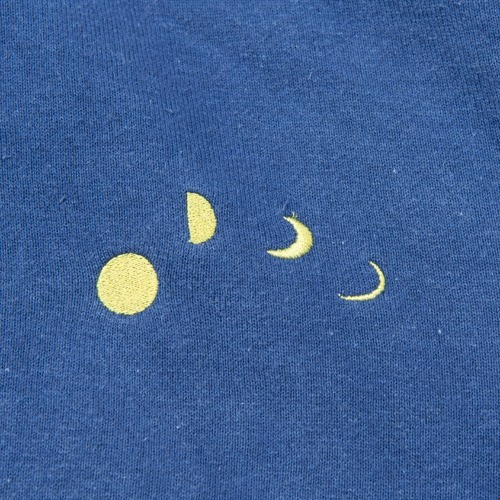職人が、1枚1枚手作業によるインディゴ染めを施されたフルジップパーカーです。綿90 麻10のスウェット素材は、とても肉感があり、いつまでも着れる、丈夫な素材です。胸の月の満ち欠けの刺繍がポイント。